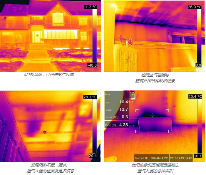 隔熱不足、濕氣入侵、建筑外圍結構缺陷是難于發現的關鍵故障。 全新的FLIR Exx系列紅外熱像儀提供優異的靈敏度和性能,能檢測到細微的溫差,較寬的視場角能瞄準寬廣的區域—因此,用戶可快速地定位并解決問題。